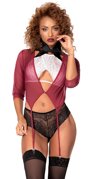Thirst for love in this Blood Sucker lingerie costume featuring a white lace bra top with a small keyhole, a red mesh garter top with a hook front closure, elbow length sleeves, adjustable garter straps, a matching lace panty, and a jagged choker. (Stockings not included.)